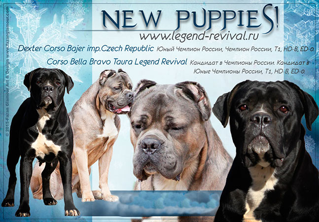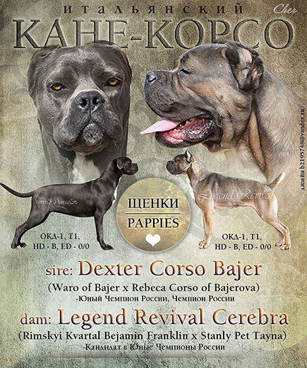 Отец - Corso Bella Brovo Graall Legend Revival ( Домициан x Stanley Pat Tayna), серый, Юный Чемпион России, Чемпион России, Чемпион РФСС, Т1, HD - В, ED - 0/0, владелец: Чернышенко М.А.